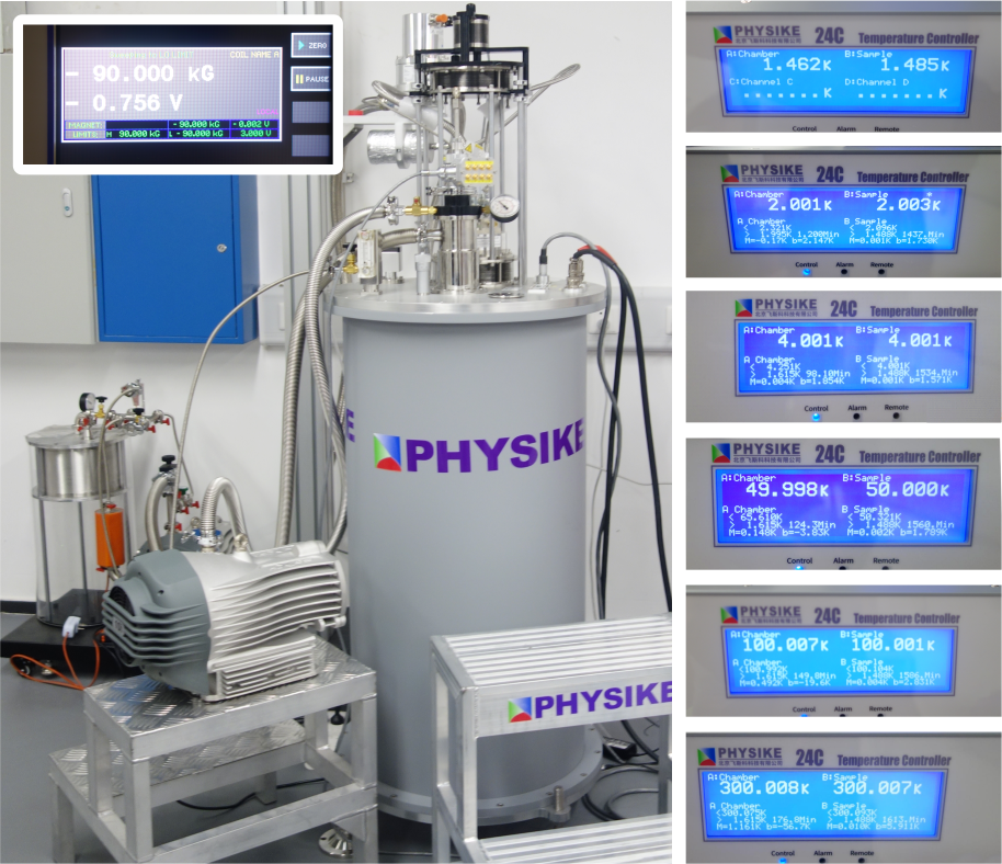 該系統(tǒng)采用閥體分離低振動(dòng)脈管制冷機(jī)作為冷源,并采用冷頭懸浮減震專利技術(shù),振動(dòng)水平小于100nm,該系統(tǒng)采用頂部裝卸型設(shè)計(jì),提供靜態(tài)交換氦氣環(huán)境,樣品管內(nèi)徑50mm,變溫范圍<1.5K-300K,磁場(chǎng)范圍:±9T。該系統(tǒng)提供了四象限雙極型超導(dǎo)電源、四通道高精度控溫儀、八通道溫度指示器和集成puck樣品托的樣品桿。