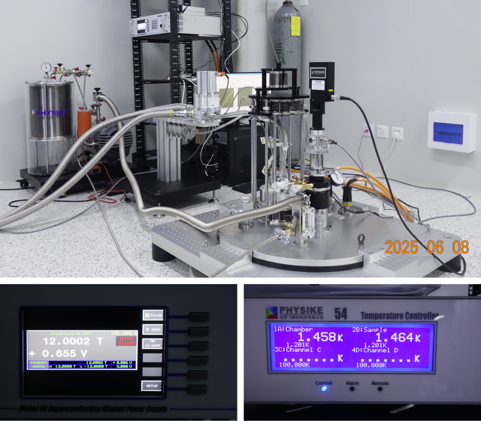 該系統(tǒng)采用閥體分離脈管制冷機(jī)作為冷源,并采用冷頭懸浮減震專利技術(shù),采用頂部裝卸型設(shè)計(jì),振動(dòng)水平:100nm,提供靜態(tài)交換氦氣環(huán)境,樣品管內(nèi)徑50mm,最低溫度:<1.5K,最高磁體強(qiáng)度為12T。