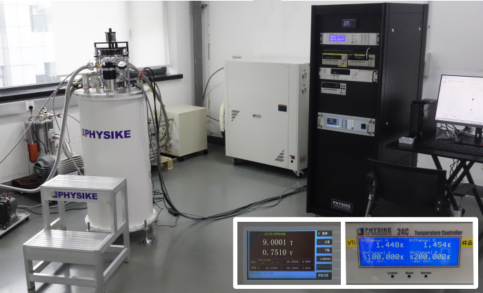 該系統(tǒng)采用GM制冷機作為冷源,并采用冷頭懸浮減振專利技術(shù),采用頂部裝卸型設(shè)計,提供靜態(tài)交換氦氣環(huán)境,樣品管內(nèi)徑50mm,變溫范圍:<1.5K-300K,磁場范圍:±9T。