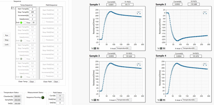 該系統(tǒng)采用進一步優(yōu)化設(shè)計,整體質(zhì)量更輕,結(jié)合自恒壓氣體處理系統(tǒng),降溫更快,勵磁更快,溫度穩(wěn)定性更好,改進型循環(huán)氣路確保長時間連續(xù)也不會出現(xiàn)堵塞現(xiàn)象。汽化器和樣品桿上面均安裝了校準型ZrON溫度計和加熱器,配合四通道高精度控溫儀,對樣品管和樣品桿進行雙控溫,在整個工作溫區(qū)實現(xiàn)優(yōu)于10mK的高溫度穩(wěn)定性。