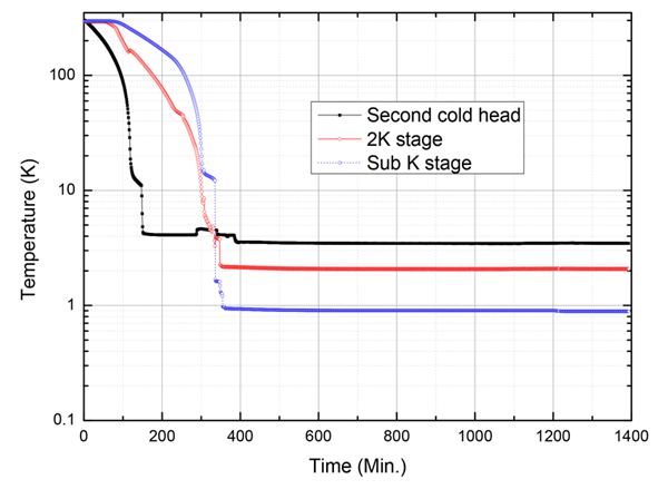 兩年前我們成功研制出高效氦循環(huán)低溫系統(tǒng)(注冊商標:Qcryo?),可將開環(huán)低溫恒溫器冷卻到1.8K,并消除常規(guī)4K制冷機的震動,已廣泛應(yīng)用于STM、SEM、AFM、顯微鏡、磁光和離子阱等對震動敏感的實驗。在此基礎(chǔ)上我們新近開發(fā)出無需He-3的亞K超低震動超低溫系統(tǒng),成功獲得<900mK的超低溫環(huán)境(最低溫度可達889mK)。